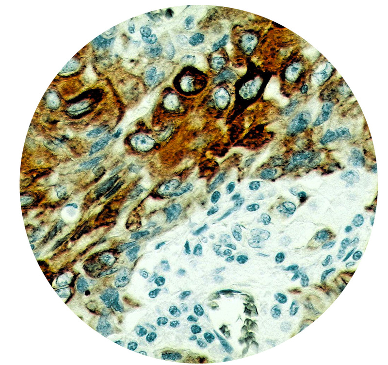 This antibody recognizes neoplastic and normal cells of epithelial origin but does not recognize cells from the epidermal basal layers.